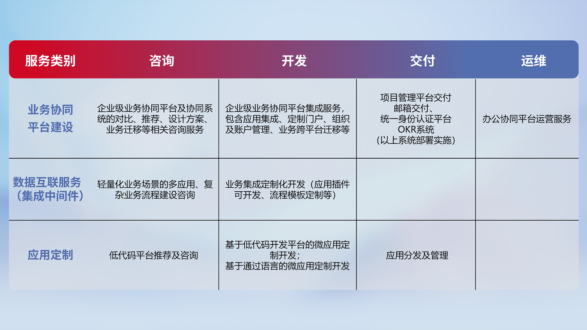 针对钉钉、、、、企微、、、、IDaas等平台级产品提供产品的规划、、方案、、、、交付、、定制化开发等服务,,,,实现如统一协同办公、、智能客户服务、、混合会议管理、、、、智能数据查询、、、等业务场景,,,实现数字化转型。。。。