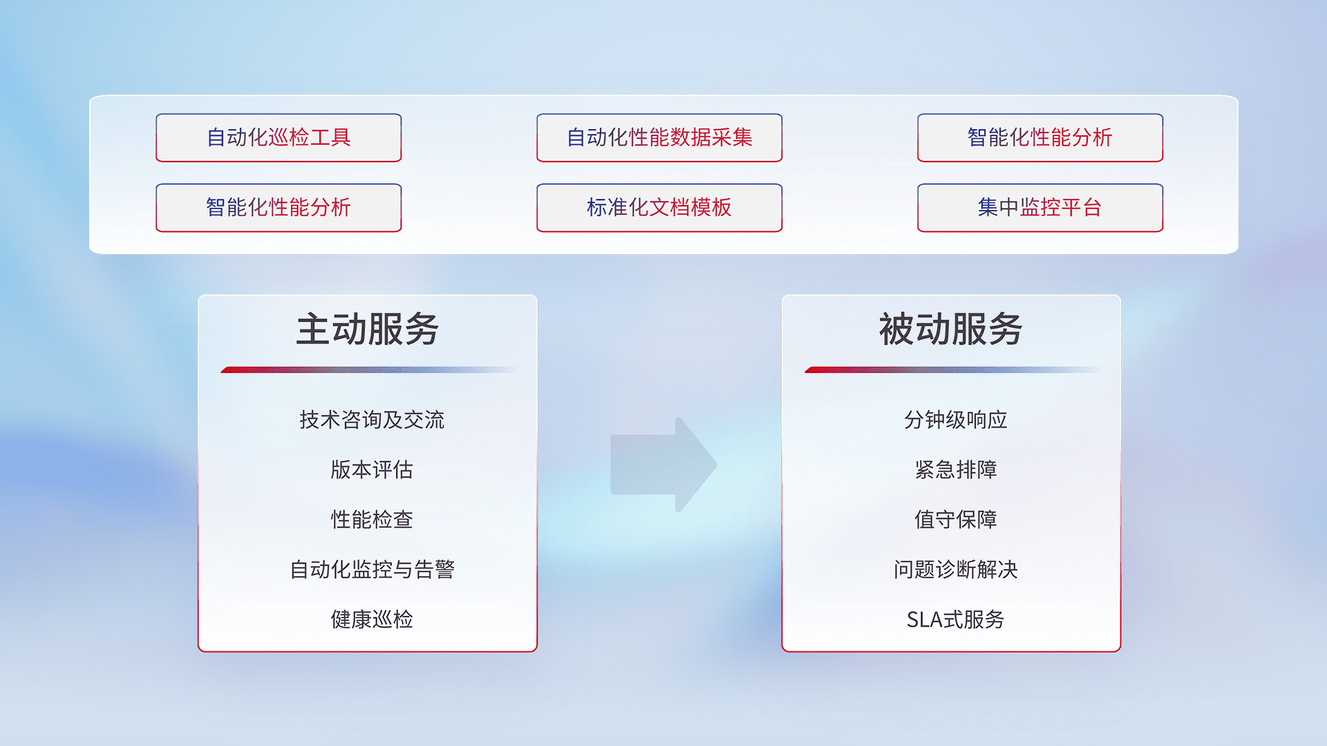 智能化工具和标准化文档,,,,保障服务质量,,,,提供主动服务(包含技术咨询、、版本评估、、、性能检查、、、、自动化监控与告警、、、、健康巡检)和被动服务包含(分钟级响应、、、、紧急排障、、值守保障、、、、问题诊断解决、、、SLA服务)。。。。