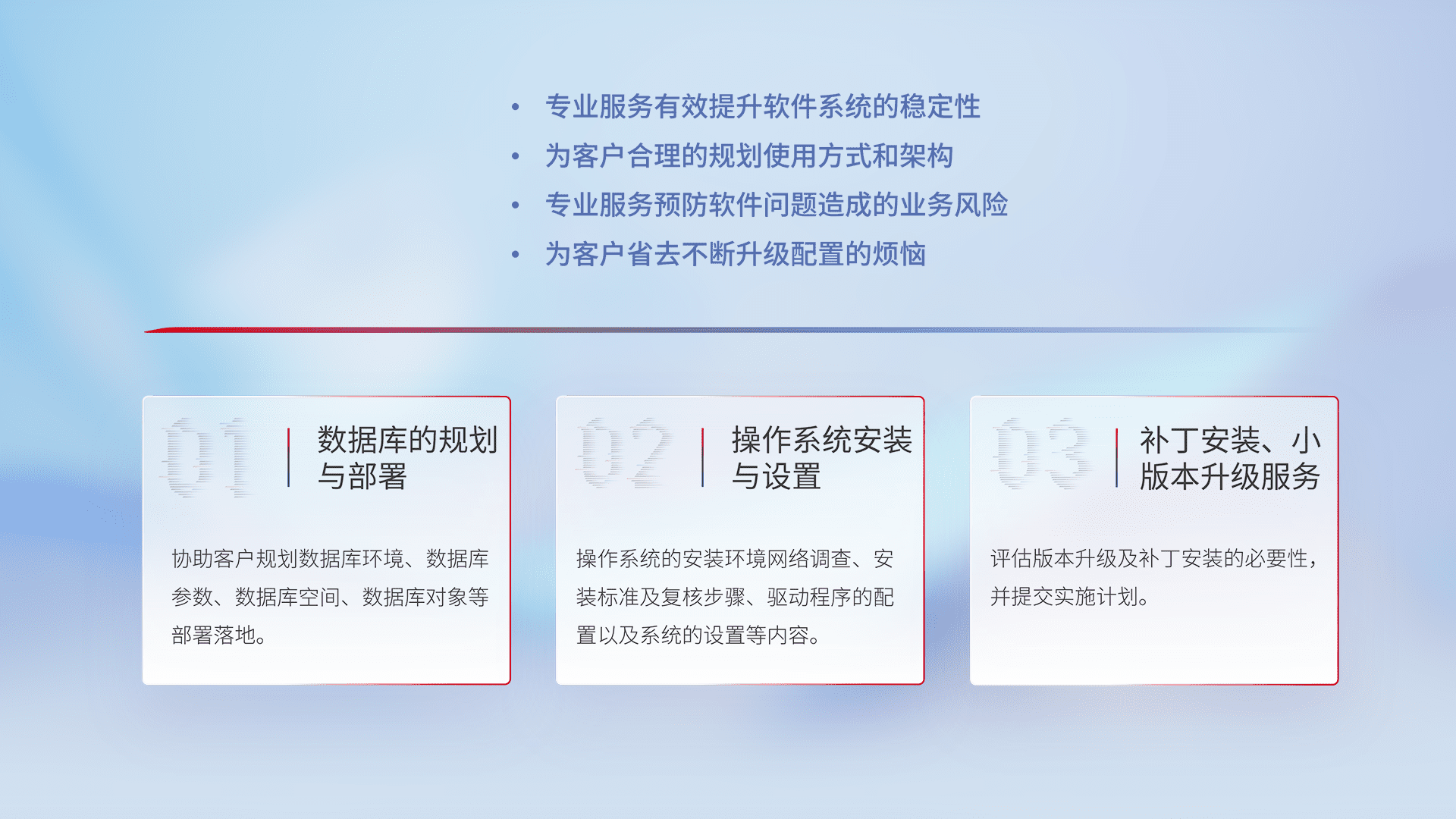 为客户提供软件规模升级、、快速部署、、、、按需配置的专业服务,,从数据库的规划与部署到操作系统的安装与设置,,再到补丁安装和小版本升级提供支持。。。。