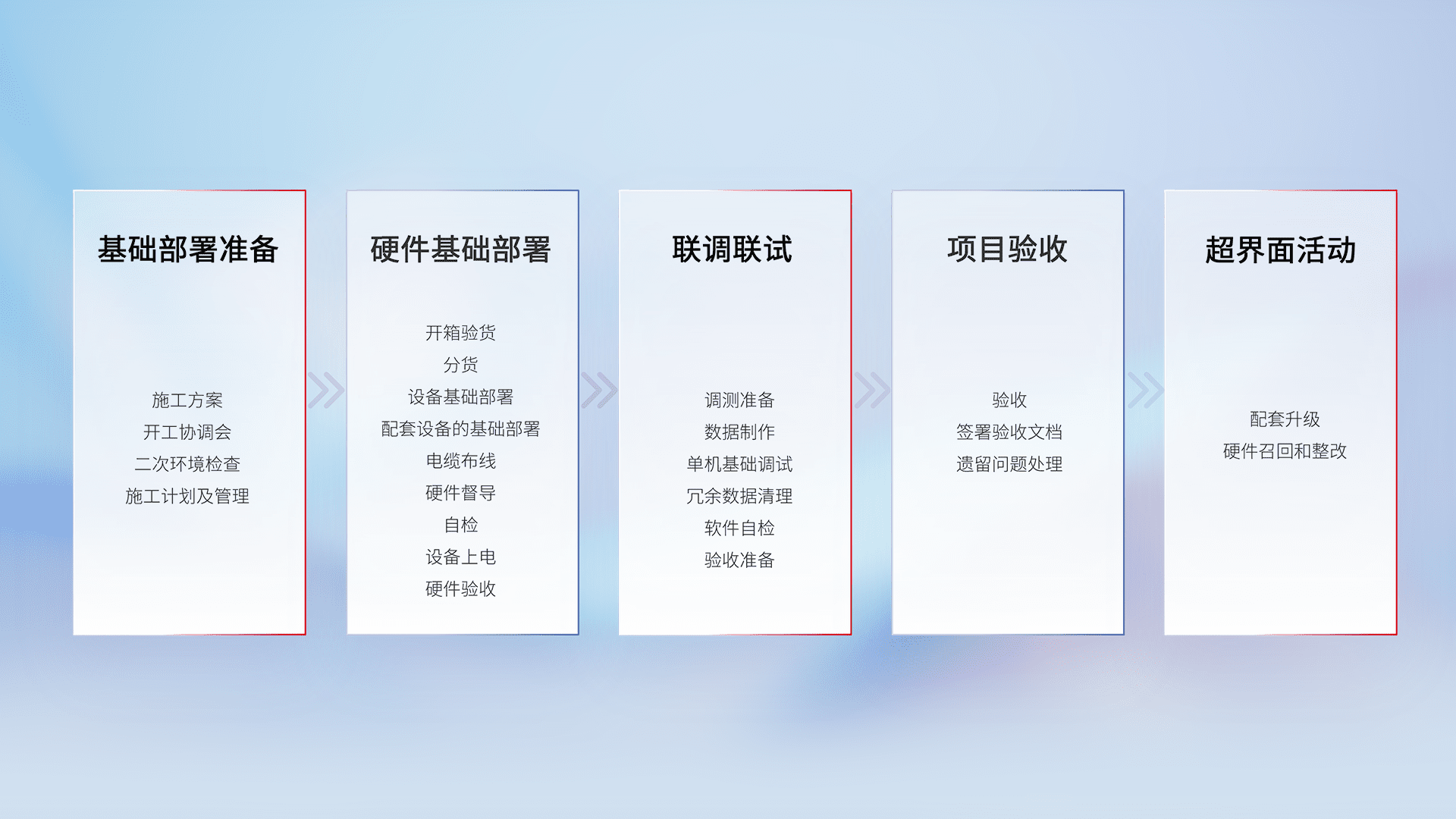 从基础部署准备、、、、硬件基础部署、、、、联调联试、、项目验收、、、、越界面活动的全过程可追溯,,,,保证施工质量和进度。。。